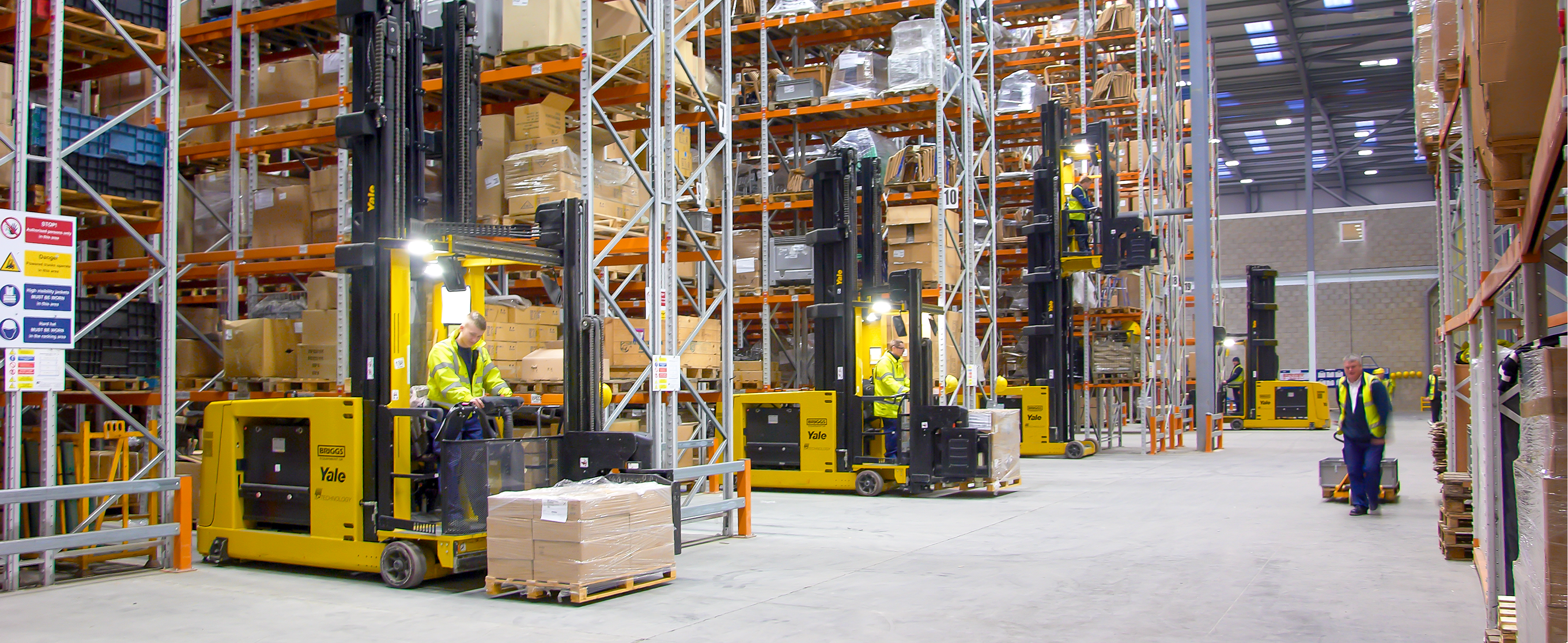 Numerous Yale turret trucks working in narrow warehouse aisle.